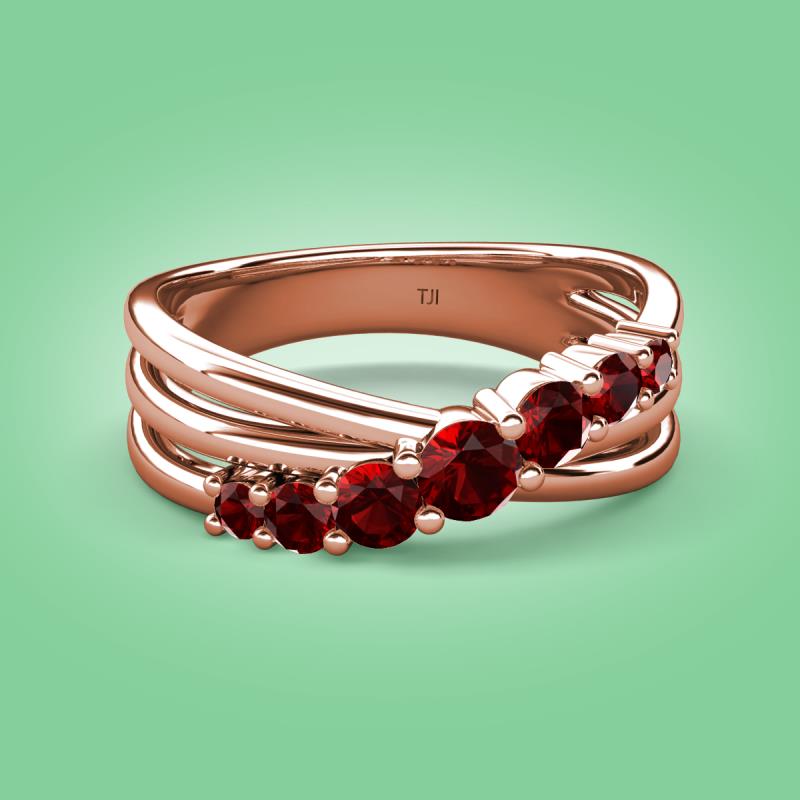 Make a statement with this stunning Wedding Band of 0.59 ctw featuring 7 sparkling Graduated Round Red Garnet set in a Prong Set with a crossover design, adding a touch of elegance and sophistication to any outfit.