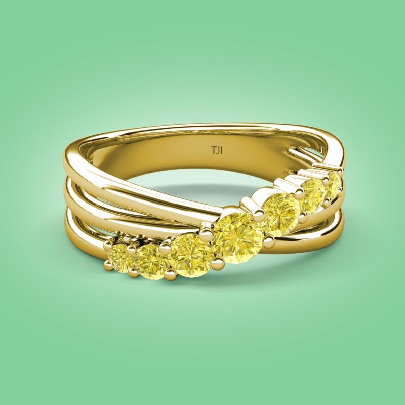 Make a statement with this stunning Wedding Band of 0.49 ctw featuring 7 sparkling Graduated Round Yellow Diamond set in a Prong Set with a crossover design, adding a touch of elegance and sophistication to any outfit.