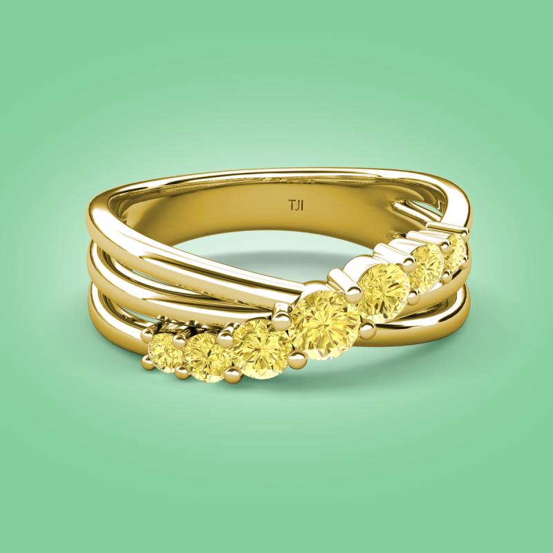 Make a statement with this stunning Wedding Band of 0.53 ctw featuring 7 sparkling Graduated Round Yellow Sapphire set in a Prong Set with a crossover design, adding a touch of elegance and sophistication to any outfit.