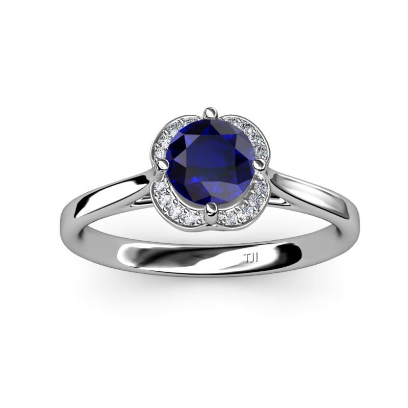 This is a Gorgeous 1.01 ct tw Floral Design Halo Engagement Ring with beautifully fitted Center Blue Sapphire with Side Round White Diamonds.
