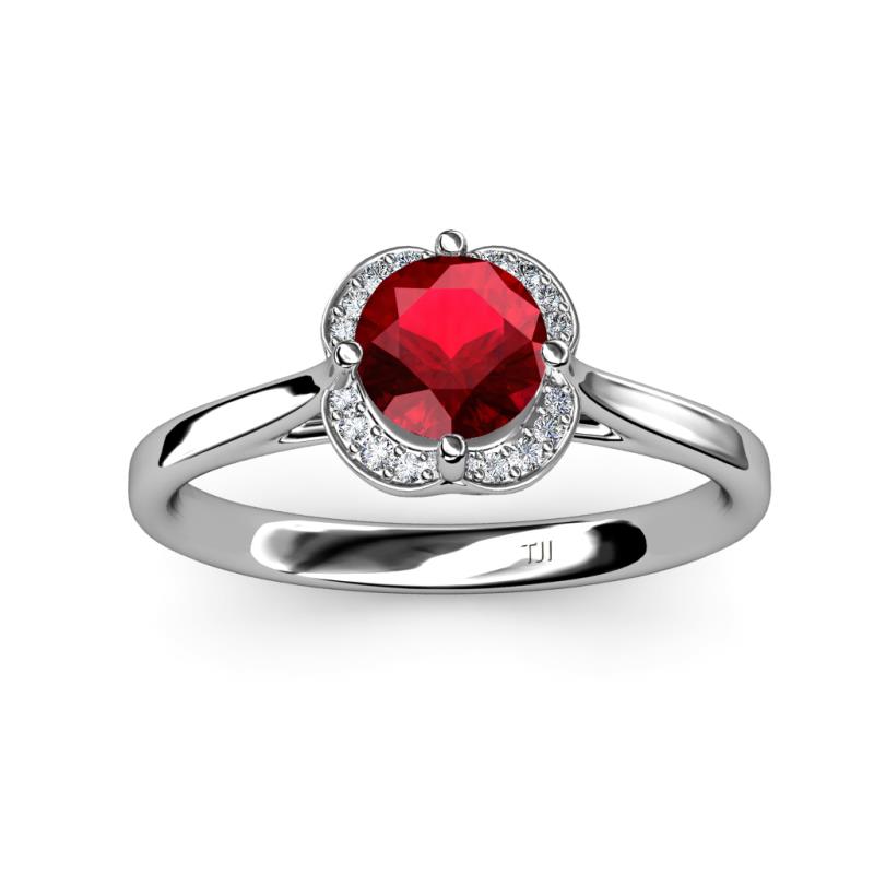 This is a Gorgeous 1.01 ct tw Floral Design Halo Engagement Ring with beautifully fitted Center Ruby with Side Round White Diamond.