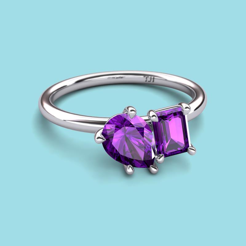 Find a beautiful symbol of everlasting love, with our new collection of duo two-stone ring. A pair of Pear Shape Amethyst shimmering alongside of a luminous Emerald Shape Amethyst crafted beautifully is all set to represent two of you together.