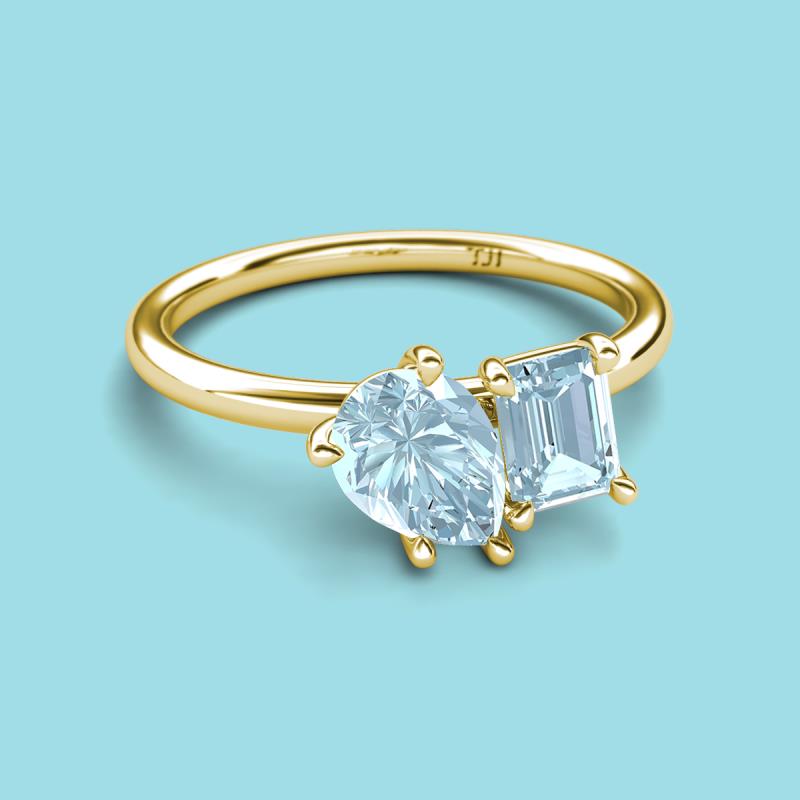 Find a beautiful symbol of everlasting love, with our new collection of duo two-stone ring. A pair of Pear Shape Aquamarine shimmering alongside of a luminous Emerald Shape Aquamarine crafted beautifully is all set to represent two of you together.