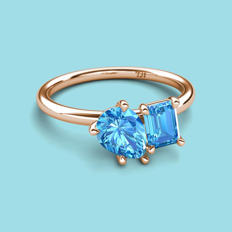 Find a beautiful symbol of everlasting love, with our new collection of duo two-stone ring. A pair of Pear Shape Blue Topaz shimmering alongside of a luminous Emerald Shape Blue Topaz crafted beautifully is all set to represent two of you together.