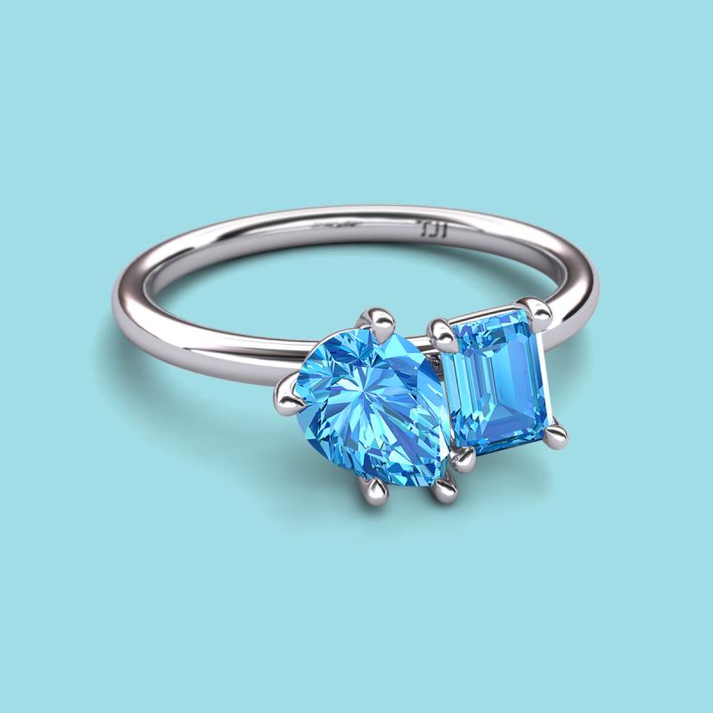 Find a beautiful symbol of everlasting love, with our new collection of duo two-stone ring. A pair of Pear Shape Blue Topaz shimmering alongside of a luminous Emerald Shape Blue Topaz crafted beautifully is all set to represent two of you together.