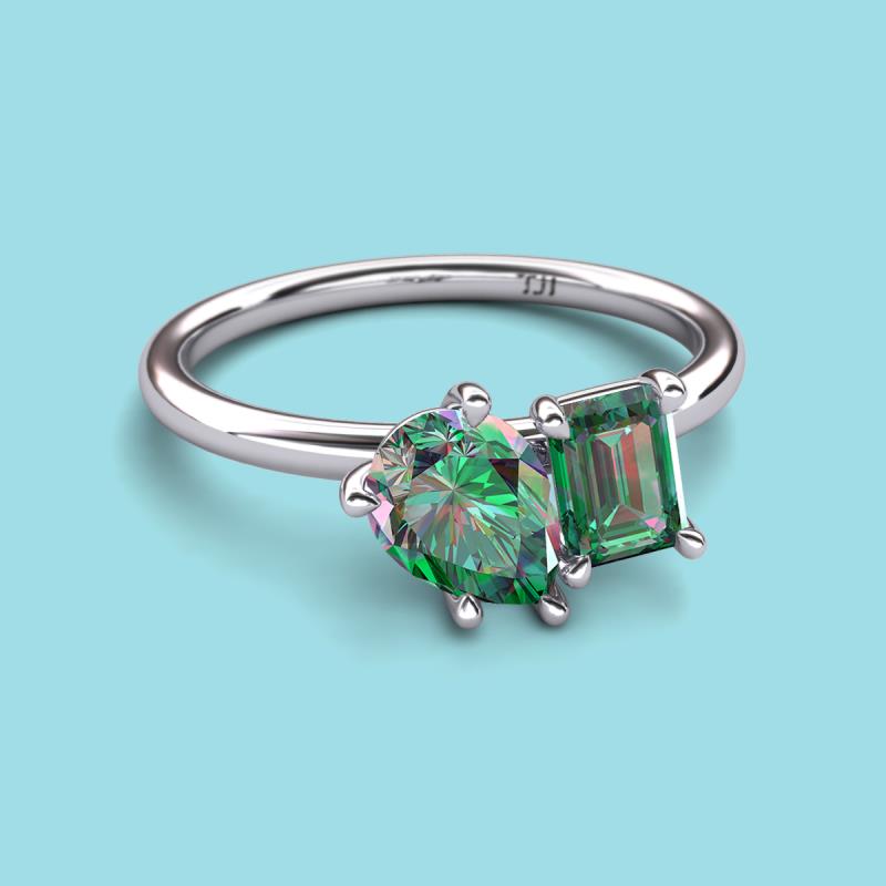 Find a beautiful symbol of everlasting love, with our new collection of duo two-stone ring. A pair of Pear Shape Lab Created Alexandrite shimmering alongside of a luminous Emerald Shape Lab Created Alexandrite crafted beautifully is all set to represent two of you together.