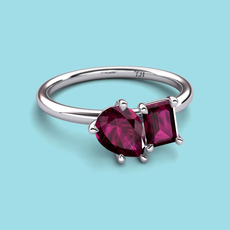 Find a beautiful symbol of everlasting love, with our new collection of duo two-stone ring. A pair of Pear Shape Rhodolite Garnet shimmering alongside of a luminous Emerald Shape Rhodolite Garnet crafted beautifully is all set to represent two of you together.