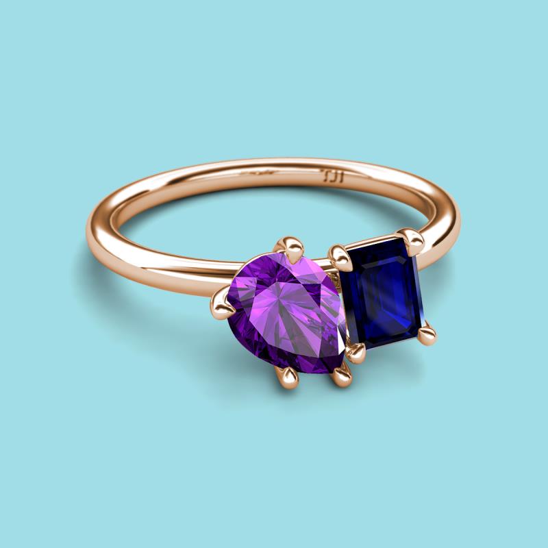 Find a beautiful symbol of everlasting love, with our new collection of duo two-stone ring. A pair of Pear Shape Amethyst shimmering alongside of a luminous Emerald Shape Blue Sapphire crafted beautifully is all set to represent two of you together.