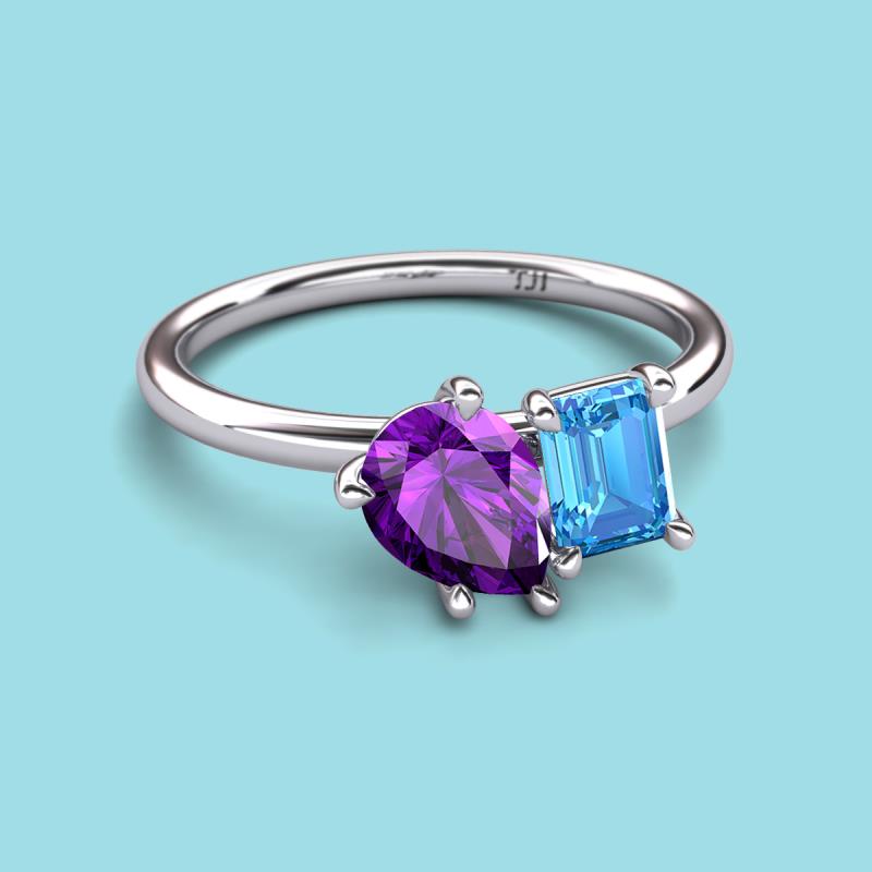 Find a beautiful symbol of everlasting love, with our new collection of duo two-stone ring. A pair of Pear Shape Amethyst shimmering alongside of a luminous Emerald Shape Blue Topaz crafted beautifully is all set to represent two of you together.