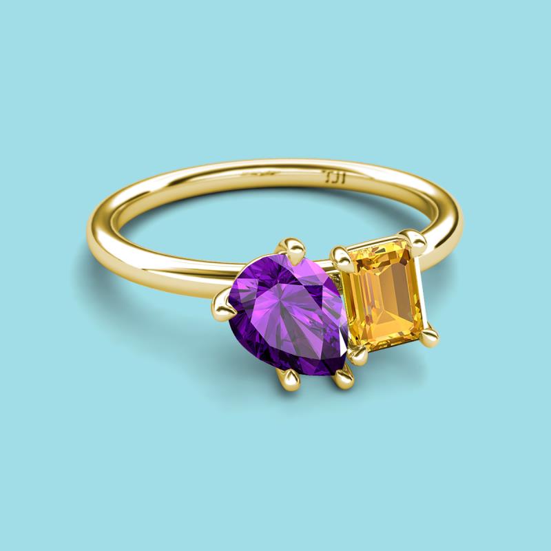 Find a beautiful symbol of everlasting love, with our new collection of duo two-stone ring. A pair of Pear Shape Amethyst shimmering alongside of a luminous Emerald Shape Citrine crafted beautifully is all set to represent two of you together.