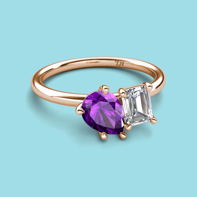 Find a beautiful symbol of everlasting love, with our new collection of duo two-stone ring. A pair of Pear Shape Amethyst shimmering alongside of a luminous Emerald Shape IGI Certified Lab Grown Diamond crafted beautifully is all set to represent two of you together.