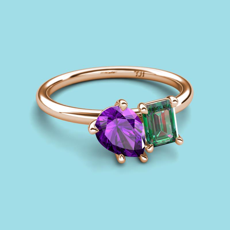 Find a beautiful symbol of everlasting love, with our new collection of duo two-stone ring. A pair of Pear Shape Amethyst shimmering alongside of a luminous Emerald Shape Lab Created Alexandrite crafted beautifully is all set to represent two of you together.