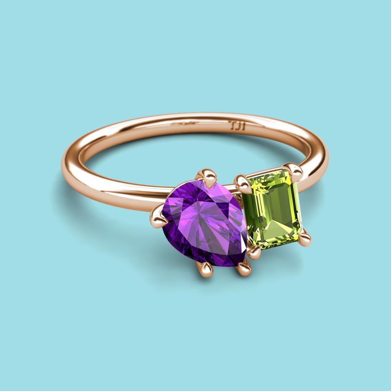 Find a beautiful symbol of everlasting love, with our new collection of duo two-stone ring. A pair of Pear Shape Amethyst shimmering alongside of a luminous Emerald Shape Peridot crafted beautifully is all set to represent two of you together.