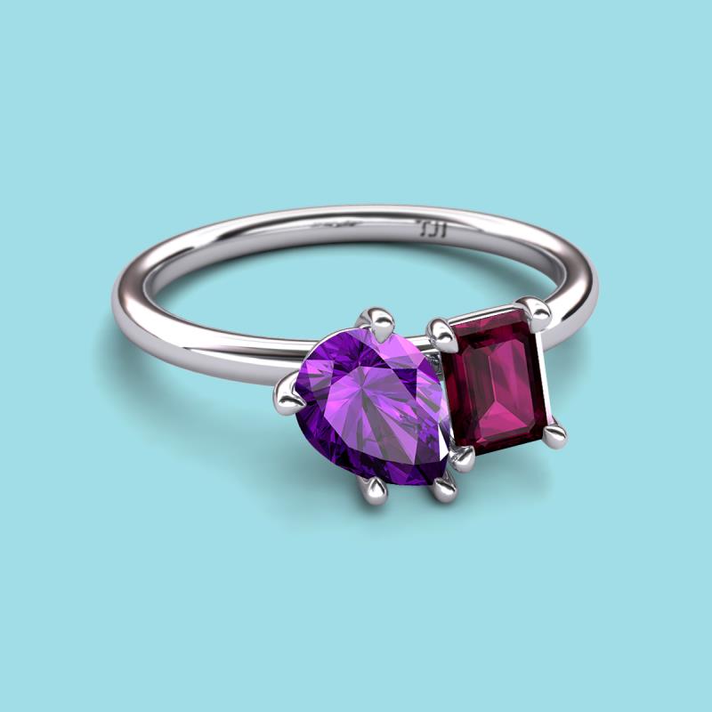 Find a beautiful symbol of everlasting love, with our new collection of duo two-stone ring. A pair of Pear Shape Amethyst shimmering alongside of a luminous Emerald Shape Rhodolite Garnet crafted beautifully is all set to represent two of you together.