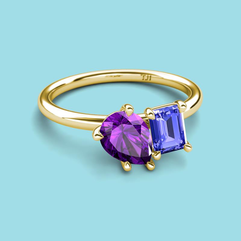 Find a beautiful symbol of everlasting love, with our new collection of duo two-stone ring. A pair of Pear Shape Amethyst shimmering alongside of a luminous Emerald Shape Tanzanite crafted beautifully is all set to represent two of you together.
