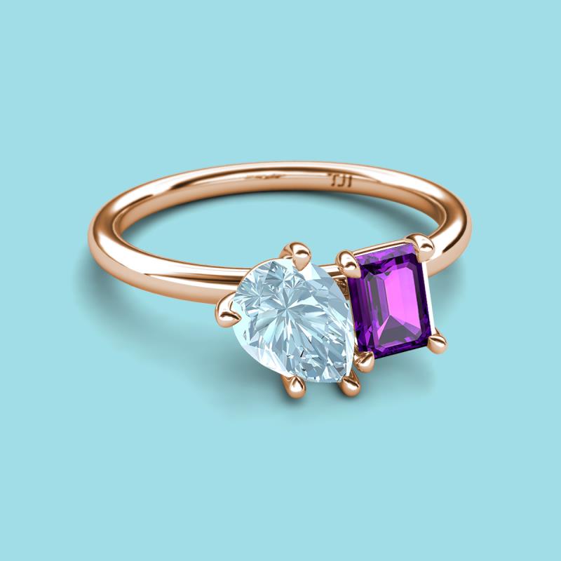 Find a beautiful symbol of everlasting love, with our new collection of duo two-stone ring. A pair of Pear Shape Aquamarine shimmering alongside of a luminous Emerald Shape Amethyst crafted beautifully is all set to represent two of you together.