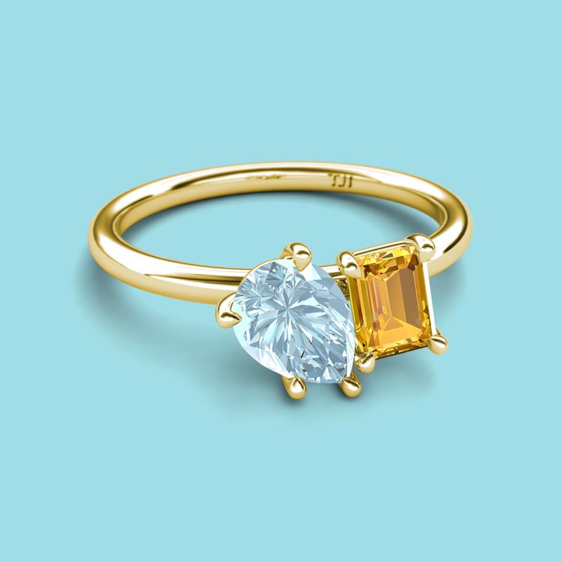 Find a beautiful symbol of everlasting love, with our new collection of duo two-stone ring. A pair of Pear Shape Aquamarine shimmering alongside of a luminous Emerald Shape Citrine crafted beautifully is all set to represent two of you together.