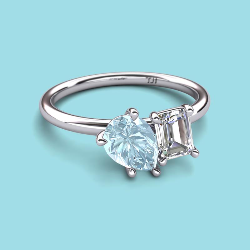 Find a beautiful symbol of everlasting love, with our new collection of duo two-stone ring. A pair of Pear Shape Aquamarine shimmering alongside of a luminous Emerald Shape Forever Brilliant Moissanite crafted beautifully is all set to represent two of you together.