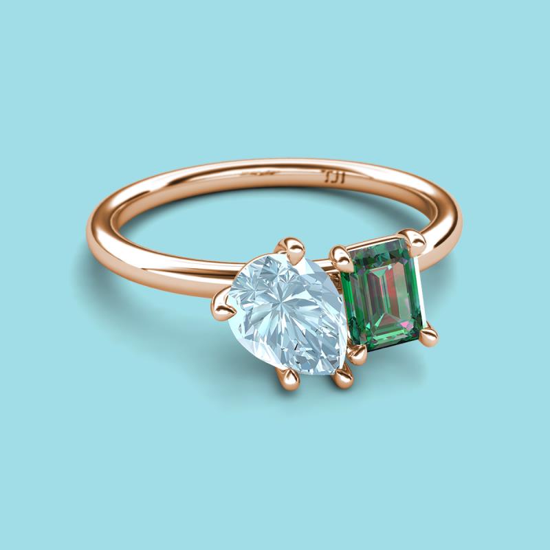 Find a beautiful symbol of everlasting love, with our new collection of duo two-stone ring. A pair of Pear Shape Aquamarine shimmering alongside of a luminous Emerald Shape Lab Created Alexandrite crafted beautifully is all set to represent two of you together.