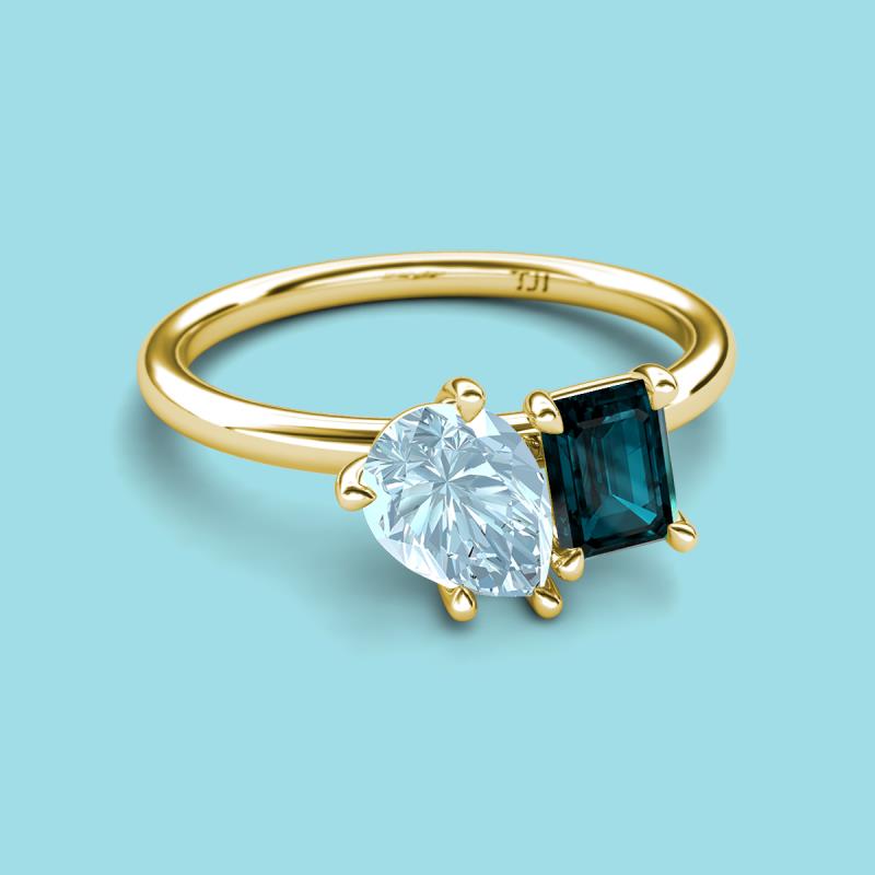 Find a beautiful symbol of everlasting love, with our new collection of duo two-stone ring. A pair of Pear Shape Aquamarine shimmering alongside of a luminous Emerald Shape London Blue Topaz crafted beautifully is all set to represent two of you together.