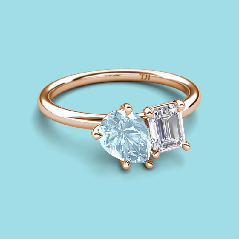 Find a beautiful symbol of everlasting love, with our new collection of duo two-stone ring. A pair of Pear Shape Aquamarine shimmering alongside of a luminous Emerald Shape White Sapphire crafted beautifully is all set to represent two of you together.