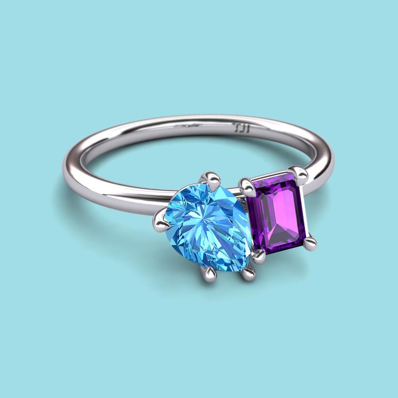 Find a beautiful symbol of everlasting love, with our new collection of duo two-stone ring. A pair of Pear Shape Blue Topaz shimmering alongside of a luminous Emerald Shape Amethyst crafted beautifully is all set to represent two of you together.