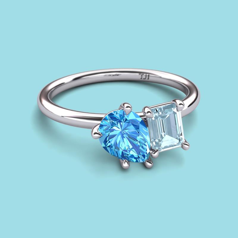 Find a beautiful symbol of everlasting love, with our new collection of duo two-stone ring. A pair of Pear Shape Blue Topaz shimmering alongside of a luminous Emerald Shape Aquamarine crafted beautifully is all set to represent two of you together.