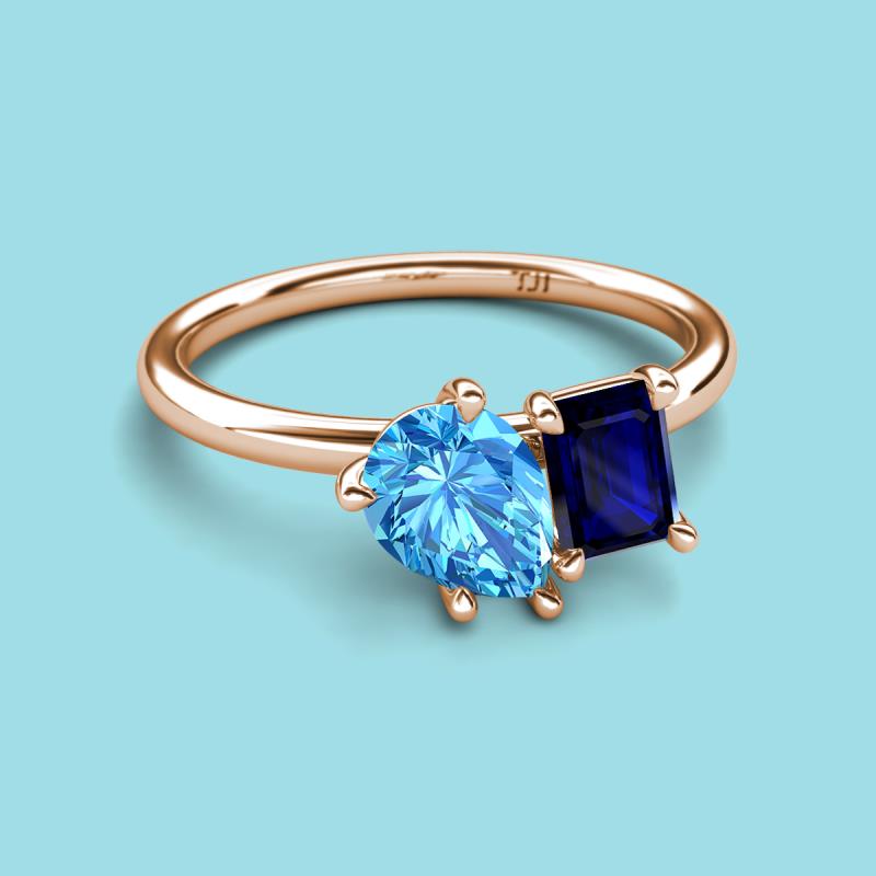 Find a beautiful symbol of everlasting love, with our new collection of duo two-stone ring. A pair of Pear Shape Blue Topaz shimmering alongside of a luminous Emerald Shape Blue Sapphire crafted beautifully is all set to represent two of you together.