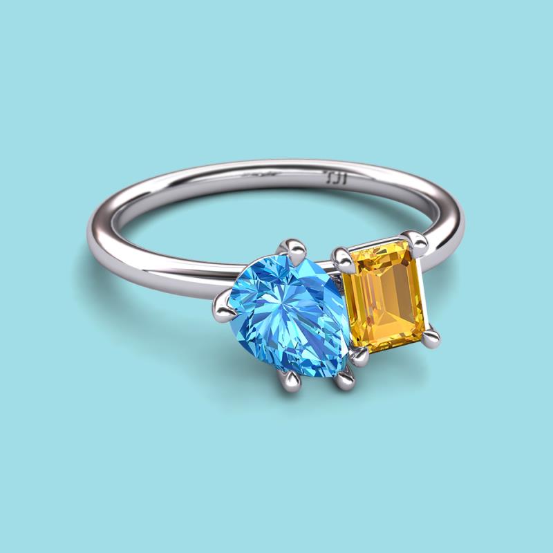 Find a beautiful symbol of everlasting love, with our new collection of duo two-stone ring. A pair of Pear Shape Blue Topaz shimmering alongside of a luminous Emerald Shape Citrine crafted beautifully is all set to represent two of you together.