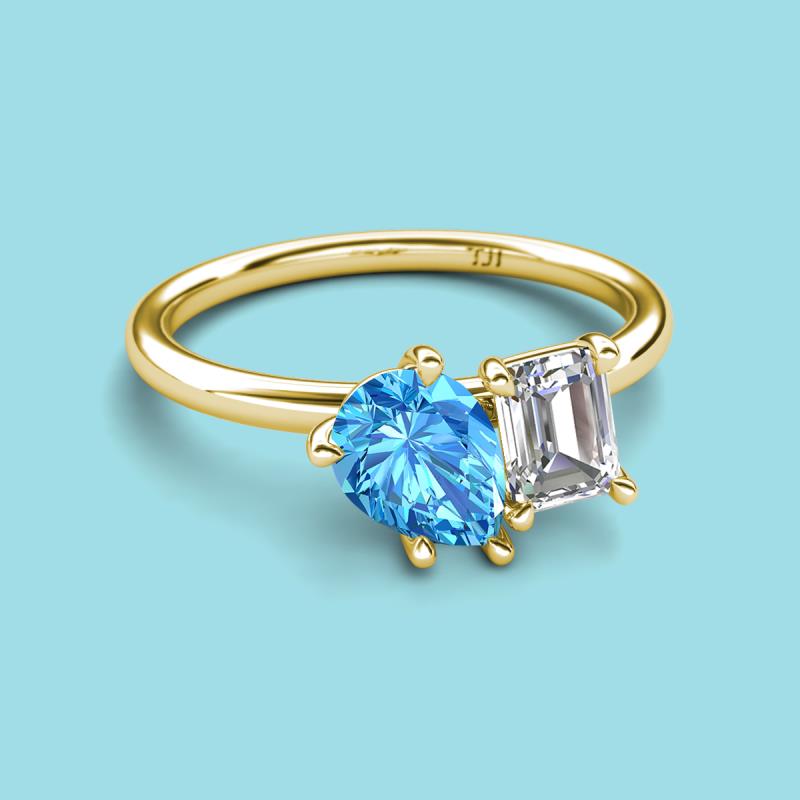 Pear Shape Blue Topaz & Emerald Shape Forever One Moissanite 2.55 ctw Four Prong Womens 2 Stone Duo Engagement Ring 18K Yellow Gold More Details ...