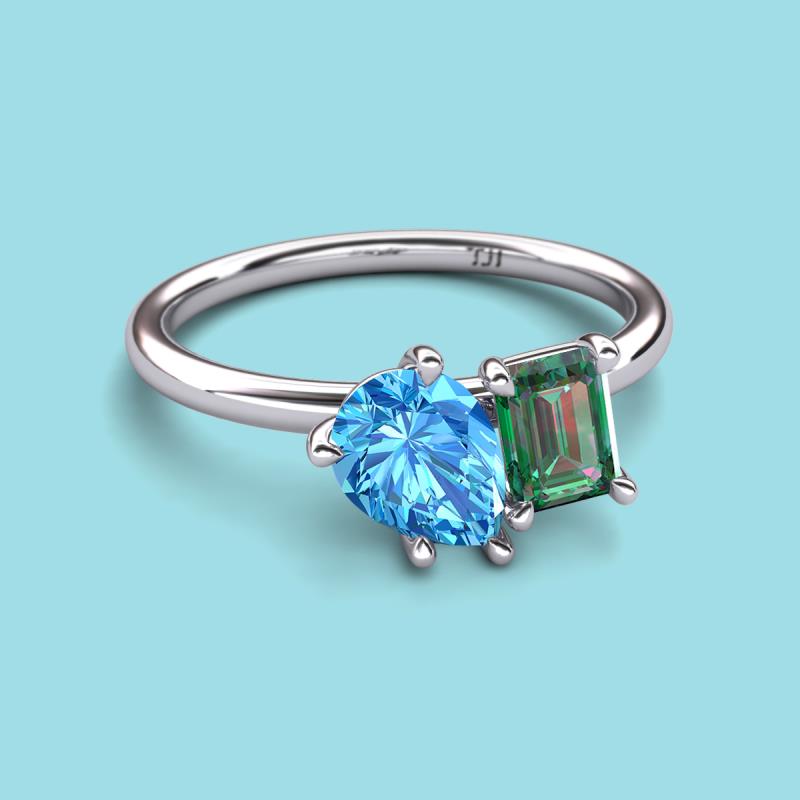 Find a beautiful symbol of everlasting love, with our new collection of duo two-stone ring. A pair of Pear Shape Blue Topaz shimmering alongside of a luminous Emerald Shape Lab Created Alexandrite crafted beautifully is all set to represent two of you together.