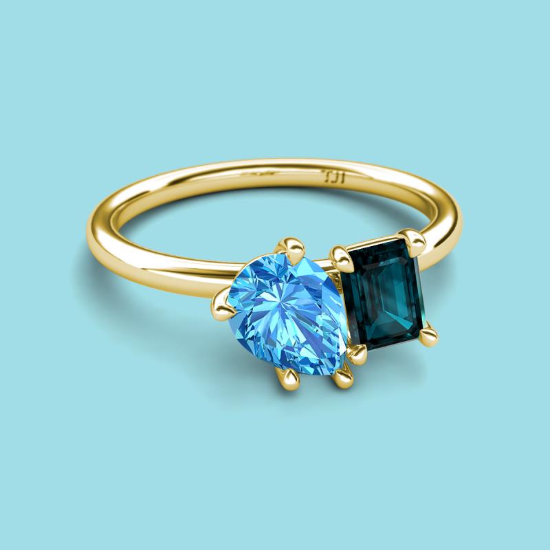 Find a beautiful symbol of everlasting love, with our new collection of duo two-stone ring. A pair of Pear Shape Blue Topaz shimmering alongside of a luminous Emerald Shape London Blue Topaz crafted beautifully is all set to represent two of you together.