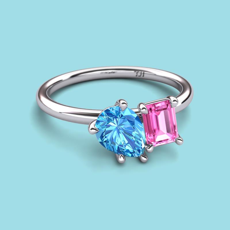 Find a beautiful symbol of everlasting love, with our new collection of duo two-stone ring. A pair of Pear Shape Blue Topaz shimmering alongside of a luminous Emerald Shape Pink Sapphire crafted beautifully is all set to represent two of you together.