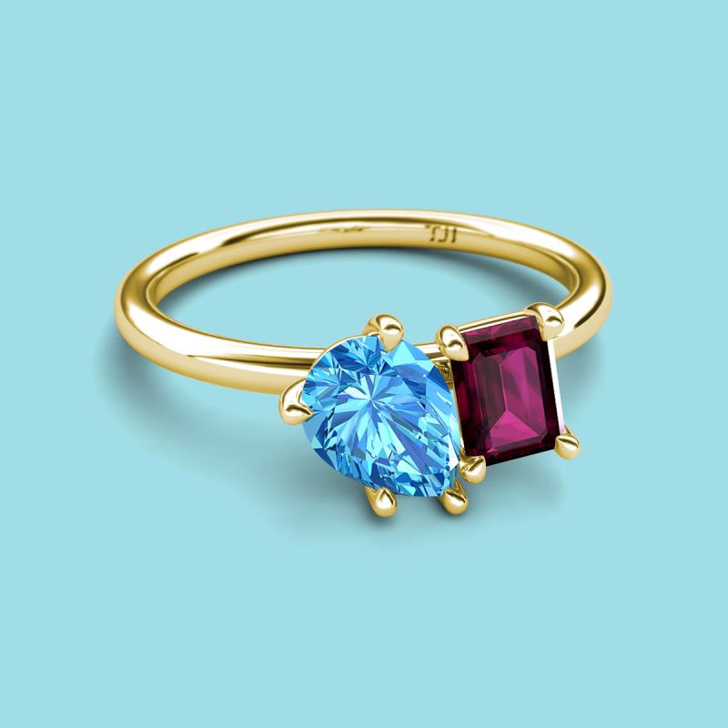 Find a beautiful symbol of everlasting love, with our new collection of duo two-stone ring. A pair of Pear Shape Blue Topaz shimmering alongside of a luminous Emerald Shape Rhodolite Garnet crafted beautifully is all set to represent two of you together.