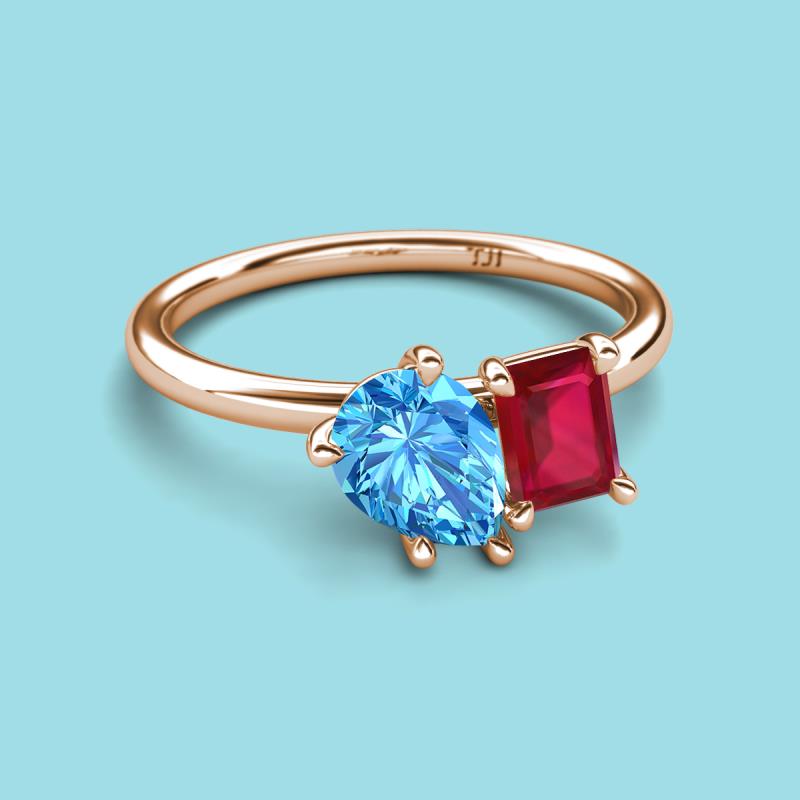 Find a beautiful symbol of everlasting love, with our new collection of duo two-stone ring. A pair of Pear Shape Blue Topaz shimmering alongside of a luminous Emerald Shape Ruby crafted beautifully is all set to represent two of you together.