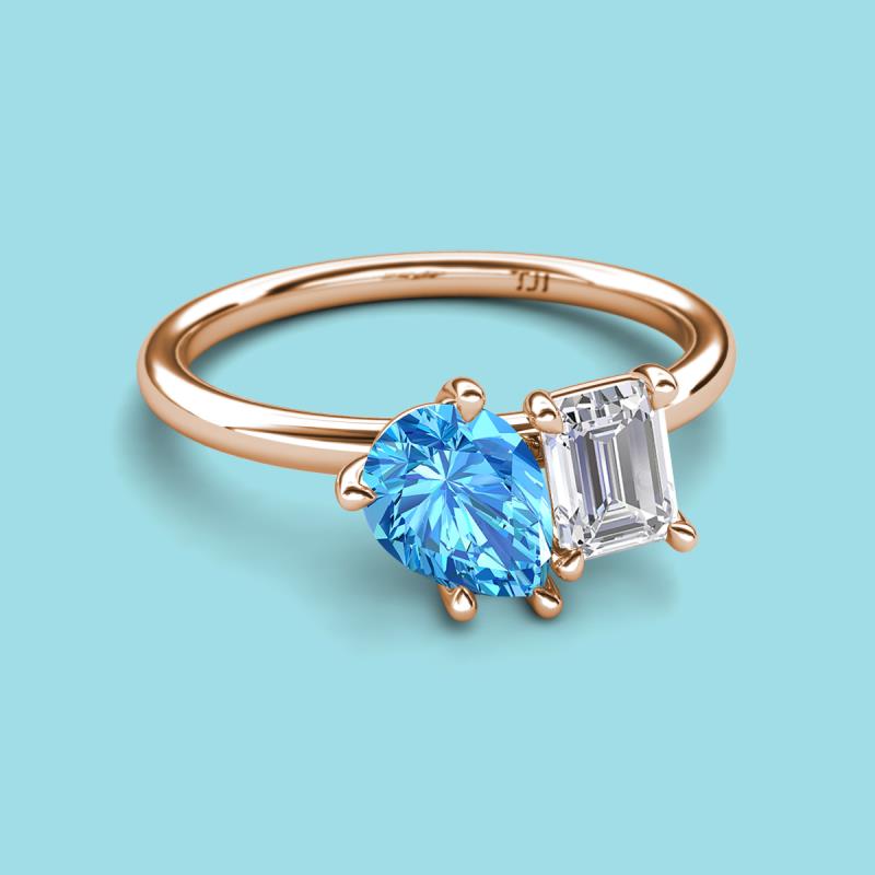 Find a beautiful symbol of everlasting love, with our new collection of duo two-stone ring. A pair of Pear Shape Blue Topaz shimmering alongside of a luminous Emerald Shape White Sapphire crafted beautifully is all set to represent two of you together.