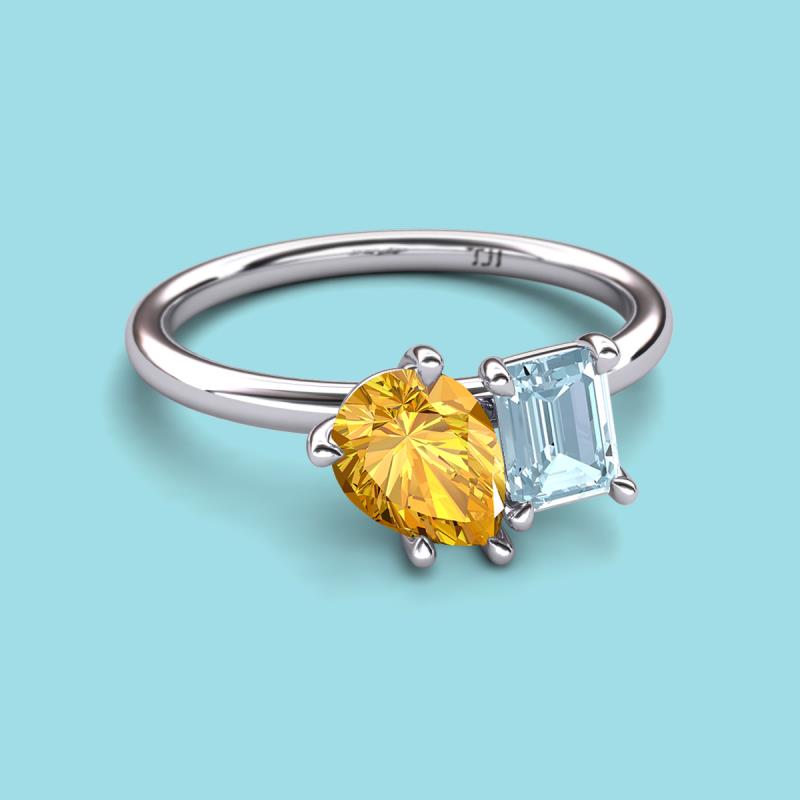 Find a beautiful symbol of everlasting love, with our new collection of duo two-stone ring. A pair of Pear Shape Citrine shimmering alongside of a luminous Emerald Shape Aquamarine crafted beautifully is all set to represent two of you together.