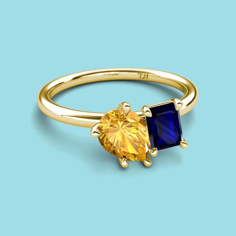 Find a beautiful symbol of everlasting love, with our new collection of duo two-stone ring. A pair of Pear Shape Citrine shimmering alongside of a luminous Emerald Shape Blue Sapphire crafted beautifully is all set to represent two of you together.
