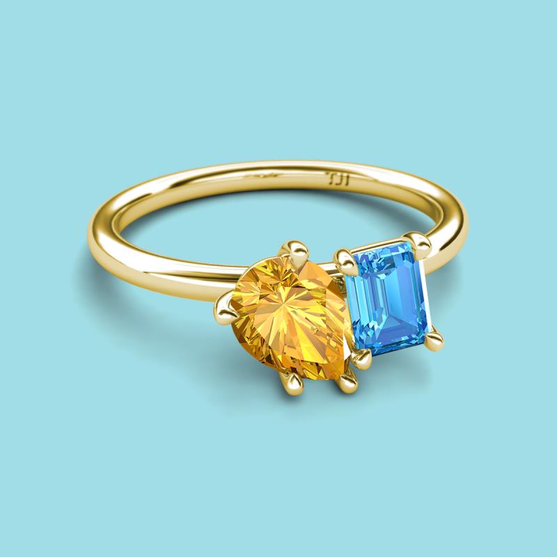 Find a beautiful symbol of everlasting love, with our new collection of duo two-stone ring. A pair of Pear Shape Citrine shimmering alongside of a luminous Emerald Shape Blue Topaz crafted beautifully is all set to represent two of you together.