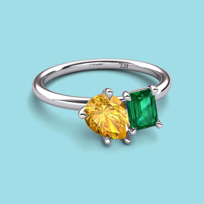 Find a beautiful symbol of everlasting love, with our new collection of duo two-stone ring. A pair of Pear Shape Citrine shimmering alongside of a luminous Emerald Shape Emerald crafted beautifully is all set to represent two of you together.