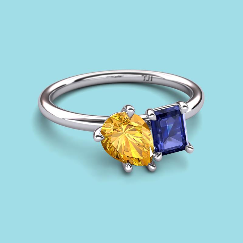 Find a beautiful symbol of everlasting love, with our new collection of duo two-stone ring. A pair of Pear Shape Citrine shimmering alongside of a luminous Emerald Shape Iolite crafted beautifully is all set to represent two of you together.
