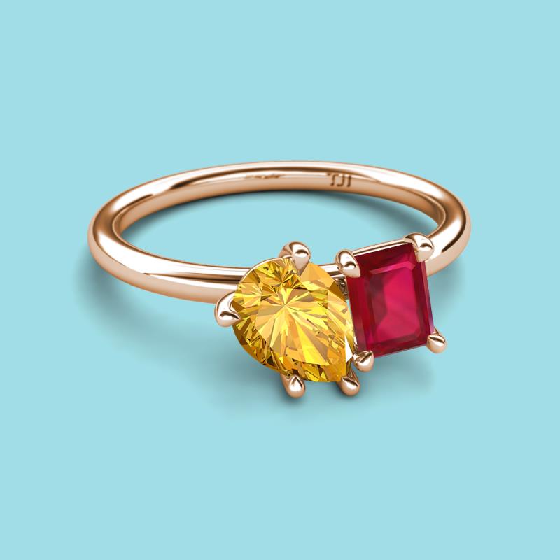 Find a beautiful symbol of everlasting love, with our new collection of duo two-stone ring. A pair of Pear Shape Citrine shimmering alongside of a luminous Emerald Shape Ruby crafted beautifully is all set to represent two of you together.