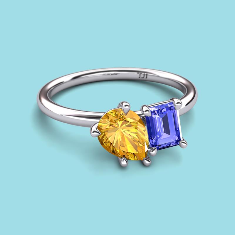 Find a beautiful symbol of everlasting love, with our new collection of duo two-stone ring. A pair of Pear Shape Citrine shimmering alongside of a luminous Emerald Shape Tanzanite crafted beautifully is all set to represent two of you together.