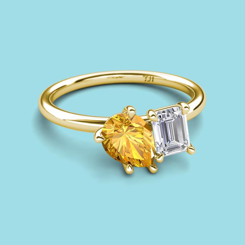 Find a beautiful symbol of everlasting love, with our new collection of duo two-stone ring. A pair of Pear Shape Citrine shimmering alongside of a luminous Emerald Shape White Sapphire crafted beautifully is all set to represent two of you together.