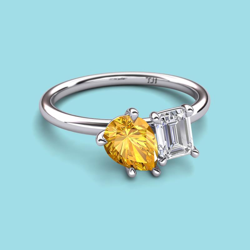 Find a beautiful symbol of everlasting love, with our new collection of duo two-stone ring. A pair of Pear Shape Citrine shimmering alongside of a luminous Emerald Shape White Sapphire crafted beautifully is all set to represent two of you together.