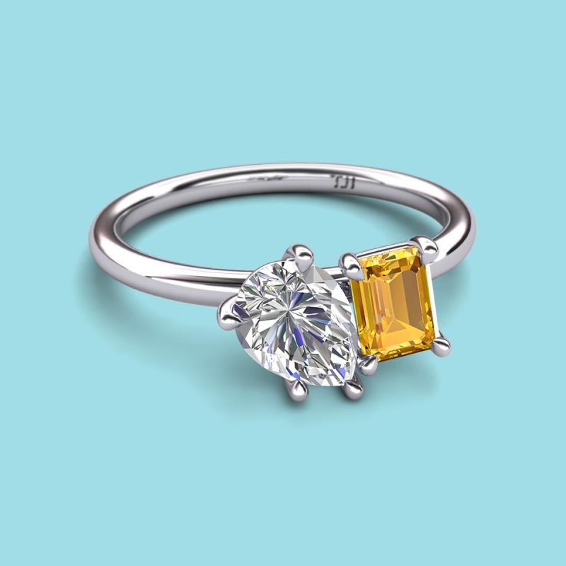 Find a beautiful symbol of everlasting love, with our new collection of duo two-stone ring. A pair of Pear Shape Forever Brilliant Moissanite shimmering alongside of a luminous Emerald Shape Citrine crafted beautifully is all set to represent two of you together.