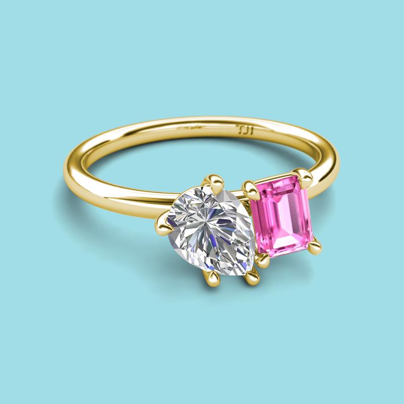 Find a beautiful symbol of everlasting love, with our new collection of duo two-stone ring. A pair of Pear Shape Forever Brilliant Moissanite shimmering alongside of a luminous Emerald Shape Pink Sapphire crafted beautifully is all set to represent two of you together.