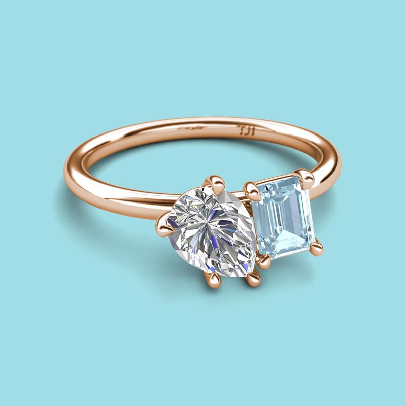 Find a beautiful symbol of everlasting love, with our new collection of duo two-stone ring. A pair of Pear Shape Forever One Moissanite shimmering alongside of a luminous Emerald Shape Aquamarine crafted beautifully is all set to represent two of you together.