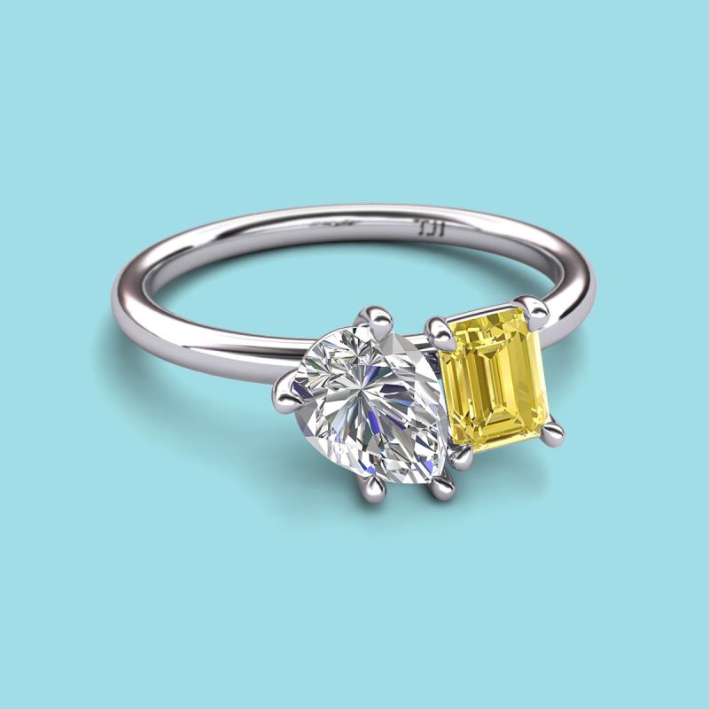 Find a beautiful symbol of everlasting love, with our new collection of duo two-stone ring. A pair of Pear Shape Forever One Moissanite shimmering alongside of a luminous Emerald Shape Yellow Sapphire crafted beautifully is all set to represent two of you together.