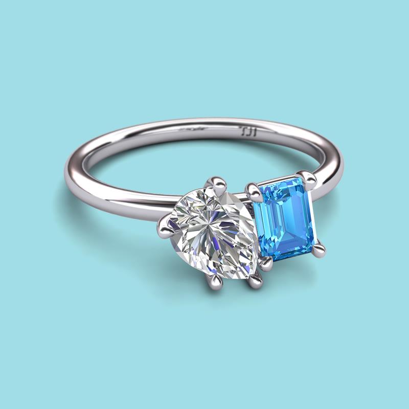 Find a beautiful symbol of everlasting love, with our new collection of duo two-stone ring. A pair of Pear Shape GIA Certified Diamond shimmering alongside of a luminous Emerald Shape Blue Topaz crafted beautifully is all set to represent two of you together.